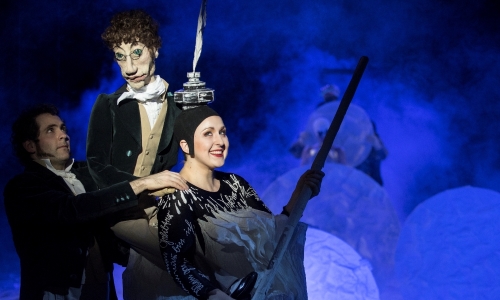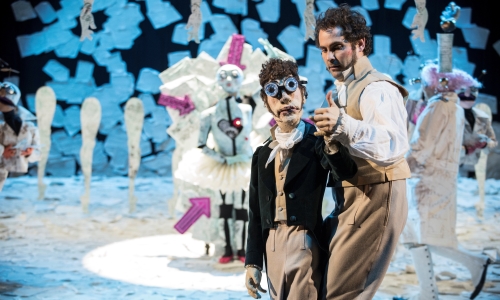 Passend zum Thema ist die Bühne mit Papierblättern übersät. Tenor Dino Lüthy, der bereits als Peter in den „Heinzelmännchen“ überzeugen konnte, ist mit Locken, Backenbart und Nickelbrille als E.T.A. Hoffmann gestylt. Die ihn umschwirrenden Musen vertreten mit entsprechenden Symbolen Musik, Malerei und Dichtkunst. Letztere wird durch Mezzosopranistin Sara Jo Benoot sowohl stimmlich als auch mimisch hervorragend verkörpert. Das böse Phantom, das Hoffmann zu Fall bringen will, wird von Bariton Insik Choi mit großer Hingabe gesungen und gespielt. Auf der Traumreise werden die Protagonisten durch Puppen gedoppelt: Hoffmann durch einen ihm nachempfundenen Pappkameraden, das Phantom durch einen künstlichen Kopf als Wurmfortsatz, Wissenschaftler tragen Muppet-Puppen auf dem Arm. „Wir wollten die drei Mittelakte der Traumreise klar vom ersten und letzten Akt trennen“, erläutert Kai Anne Schuhmacher. „Dazu haben wir das Spiel mit den Masken eingeführt, die eine andere Welt, eine andere Spielweise symbolisieren. Das Phantom als Puppe personifiziert die Angst. Der reale E.T.A. Hoffmann war Trinker und haderte oft mit sich selbst. Es geht darum, diese Angst zu stillen. Wir haben dafür einen anderen Ausdruck als den des Menschen gewählt.“