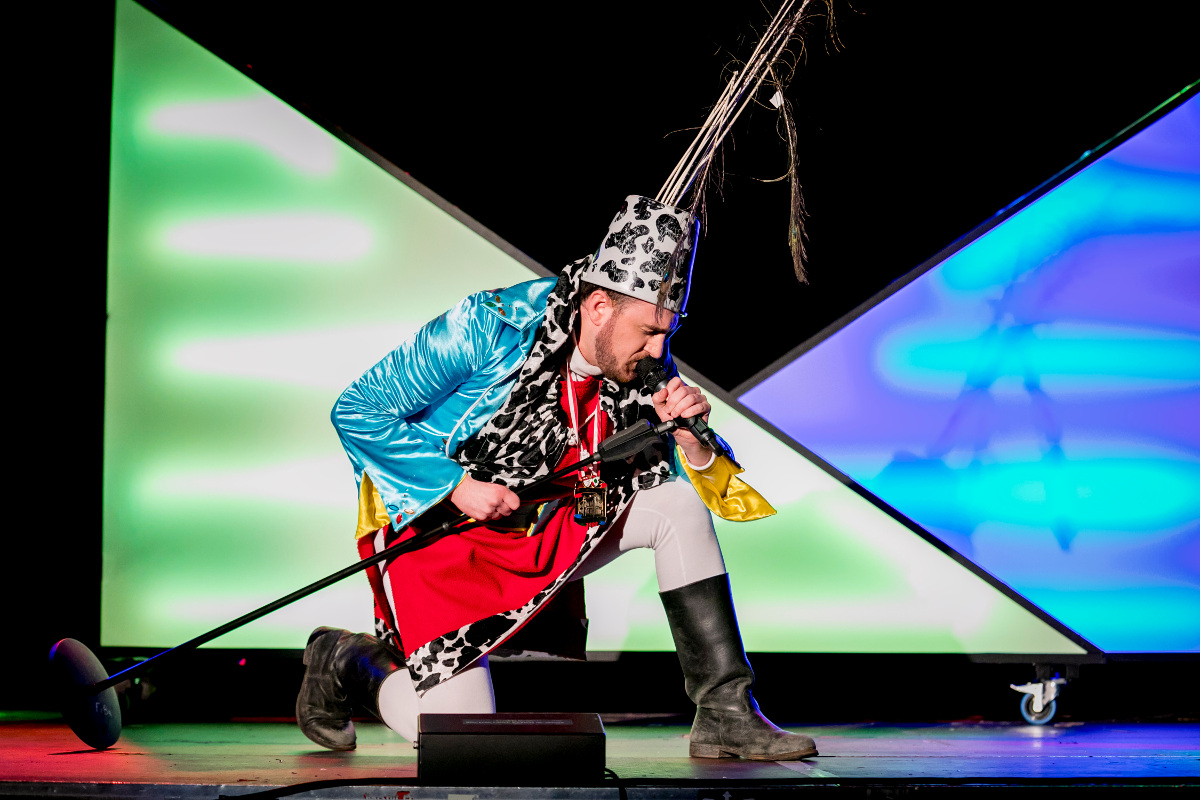 Den Einzug von Ehrenfeld „op der Schälsick“ trat man dann auch standesgemäß mit Trompeten und Fanfaren in Bauarbeiter-Montur an – stimmig unterlegt mit Billie-Eilish-Cover. Präsident und Pate der fatal-banalen Karnevalssitzung Christoph Stubbe dagegen kam etwas später nach – auch er noch ausgestattet mit Umzugskarton und den besten schlechtesten Wortspielen, die der Essig so hergibt. Das Fazit: „Fatal Banal in der Essigfabrik – denn süß kann jeder.“