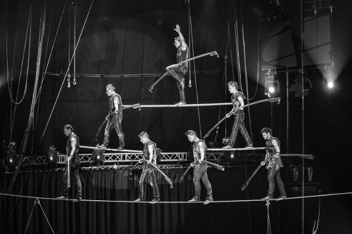 Die Drohung zeigte Wirkung, hatte doch der Zirkussprecher zu Beginn der Show angekündigt, dass das Fotografieren mit Blitz mit einem Konzert von Helene Fischer nicht unter 2 Stunden bestraft würde: Jeder im vollbesetzten Zelt hatte sich daran gehalten. Wobei natürlich diskutabel ist, ob eine solche Ironie gegenüber Show-Kollegen akzeptabel ist. Egal, die Bemerkung hatte nicht nur einen Heiterkeitserfolg, sondern setzte das Kölner Premierenpublikum gleich auf die richtige Spur: atemberaubende Artistik neben lockerem und gekonnten Humor. So wurde auch die Pause mit vier schwarz verhängten Wesen angekündigt, die etwas tranken, eine Tüte Popcorn zerkrümelten und qualmten; einer pinkelte gar mit kräftigem Strahl in eine große Tonne. Genauso die Schlussszene: In den Zirkusrund zieht eine lange schwarze Karawane ein, nach einer Sekunde Dunkelheit stehen alle da in ihrem Showkostüm und ziehen aus mitten durch die Zuschauer. Ein Beispiel für die perfekte Choreografie der knapp drei Stunden: Alle Szenen gingen fast unsichtbar ineinander über, ohne erkennbare Pausen, mal hoch oben in der Zeltkuppel, mal unten am Boden.