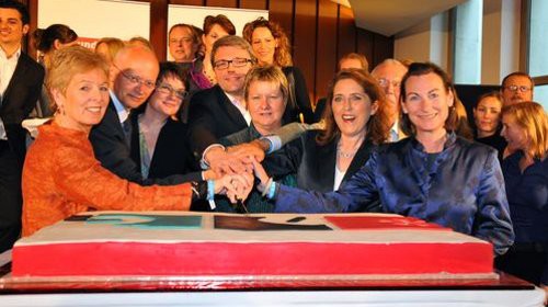 Das Kerngeschäft soll aber weiterhin der Film bleiben. Und so war die Filmparty mit rund 800 geladenen Gästen auch in diesem Jahr eine Filmparty und als solche neben Besuchern aus der Politik wie Kölns Oberbürgermeister Jürgen Roters oder dem Direktor der Landesanstalt für Medien NRW, Jürgen Brautmeier, vor allem geprägt von den zahlreichen prominenten Filmschaffenden. Die Liste der Gäste ist lang: die Regisseure Philip Gröning („Die große Stille“), Oskar Roehler („Jud Süß“), Ali Samadi Ahadi („Salami Aleikum“) und Sönke Wortmann („Das Wunder von Bern“), die Schauspieler Charly Hübner („Das Leben der anderen“, Polizeiruf-Komissar Bukow), Dennis Moschitto („Almanya – Willkommen in Deutschland“) und Maria Schrader (Rosenstraße“) und die Produzenten Tom Spieß („Deutschland – ein Sommermärchen) und Bettina Brokemper („Antichrist“, „Melancholia“) – sie alle feierten das 20-jährige Jubiläum der Filmstiftung und ihre Neuausrichtung im mondänen Jahrhundertsaal im Kölner Gerling-Quartier bis in die Nacht hinein, während das alte Logo der Filmstiftung in einem symbolischen Akt als riesige Torte verspeist wurde.