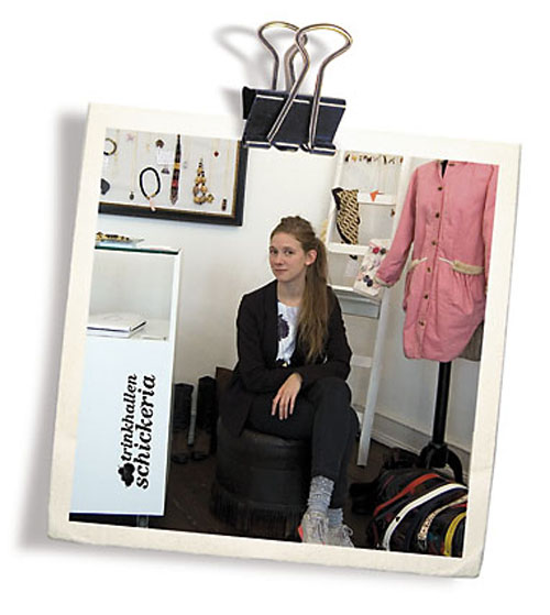 Cheers. Aus dem Pressetext des Ladens und Labels Trinkhallen Schickeria: "Ich liebe schlafen ü̈ber alles und Süssigkeiten. Ich mag schöne Sachen machen." Die verspielte Leichtigkeit in den Worten der Inhaberin Lena Schröder spiegelt sich in ihren Designs wieder. Ihre kreierten tragbaren Streetwear-Kollektionen verkauft sie neben Vintage Mode aus den 80ern von u.a. Joop und Escada ebenso wie Schmuck-Unikate. Tipp: Lena ist mit ihrem Label vom 2. bis 4. Dezember auf dem weekend Fest im alten UFA-Palast!