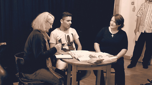Ein eingeladener Flüchtling, Jabbar Abdullah, der in Syrien gerade sein Archäologiestudium beendet hatte, als in Darʿā und Homs die Proteste begannen, schilderte in von Bender übersetztem Arabisch seine Erlebnisse in Syrien und bei der anschließenden Flucht, die ihn nach etwa einem Jahr schließlich nach Köln brachte. Hier ginge es ihm gut, die Zustände in den Flüchtlingslagern außerhalb und in den Randzonen Europas beschrieb er allerdings als kaum erträglich. Frau Sabra nannte die UN-Flüchtlingsagentur (UNHCR) stark unterfinanziert. Auch über die extrem hohen Kosten einer Flucht nach Europa – gern mal 20.000 Euro – sind sich wahrscheinlich viele nicht im Klaren. Renate Schüler von der Kölner Syrienhilfe, die bis 1980 in Syrien lebte und mit ihrem Netzwerk den in Köln angekommenen Syrern helfen will, erklärte, dass die Erstunterbringung in der Herkulesstraße (die ehemaligen Büros der Kfz-Zulassungsstelle) in vielen Bereichen schlecht organisiert gewesen wäre und sie daher zunächst versucht habe, im Bekanntenkreis vergessene Dinge wie Handtücher zu organisieren. Sie war sich mit Frau Bender einig, dass es leider sehr viel zu tun gebe und man auch Dolmetscher brauche, die die neuen Nachbarn etwa bei der auf lange Sicht notwendigen Arbeits- und Wohnungssuche unterstützen könnten. Außerdem fehle eine Deutschförderung vor dem ersten Schulunterricht. Die Gäste stellten sich alle für potentielle Mithelfer als Ansprechpartner zur Verfügung.