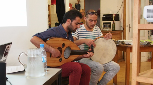 Dies sind freilich nur einige der Dinge, die es in den zweieinhalb Stunden im großen Hinterraum des Allerweltshauses zu sehen und hören gab. Interessante Wortmeldungen der etwa 30 Besucher, darunter Studenten, Ausländer und ein Dokumentarfilmer, schienen bei verschiedenen Sichtweisen auf große Einigkeit hinzudeuten. Renate Schüler brachte ein, dass sie seit ihrer Rückkehr nach Deutschland vor 34 Jahren im Fernsehen ständig das Wort Islam mit Bildern von Betenden verknüpft sehe und sie diese reduzierte Sichtweise immer wieder ärgere. Nach der Abschlussdiskussion spielten die beiden musikalischen Gäste Khater Dawa und Majd Alhamwi ein letztes Stück, das wie ein auf innerer Widerstandskraft ruhendes Klagelied wirkte. Sabra und Bender, die durch einen informativen und von Gästen mit Leben erfüllten Abend führten, wollen weiterhin auf die Lage der Syrer aufmerksam machen und fühlten sich von der Resonanz ermutigt.