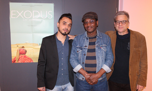 Donnerstag, 22. März: Bereits zu Beginn des Jahres hatte Hank Levines neuer Film „Exodus – Der weite Weg“ im Rahmen des „Stranger than Fiction“-Festivals in Köln seine Deutschlandpremiere gefeiert. Zum offiziellen Bundesfilmstart folgte nun eine Berliner Premiere und am Tag danach eine weitere Vorstellung des Films in Köln, zu der auch wieder der Regisseur und zwei seiner Protagonisten anwesend waren, um die zahlreichen Fragen des Publikums zu beantworten. Da sich Levine in seinem Film mit der weltweiten Flüchtlingsproblematik unserer Zeit beschäftigt, war er damit am Puls der Zeit und sorgte in der Außenspielstätte des Schauspiels Köln am Offenbachplatz für eine angeregte Diskussion nach der Projektion des Films. Levine freute sich, dass „nach diesem großen, langwierigen Projekt“ viele seiner Mitwirkenden zur Preview nach Köln gekommen waren, neben etlichen Crewmitgliedern und der WDR-Redakteurin Jutta Krug insbesondere Bruno Watara und Nizar Raja. Die beiden Letztgenannten sind zwei der Protagonisten aus „Exodus – Der weite Weg“, deren beschwerlichen Fluchtweg Hank Levine in seinem Film zumindest teilweise mit der Kamera mitverfolgt hat. Nizar hatte als Palästinenser in Syrien gelebt, bis ihn der Bürgerkrieg zur Flucht bewegte. Nachdem ihm zunächst in Brasilien Asyl gewährt wurde, reiste er von dort zu seinem bereits vor ihm geflohenen Bruder nach Kuba, um von dort die Reise nach Deutschland anzutreten.