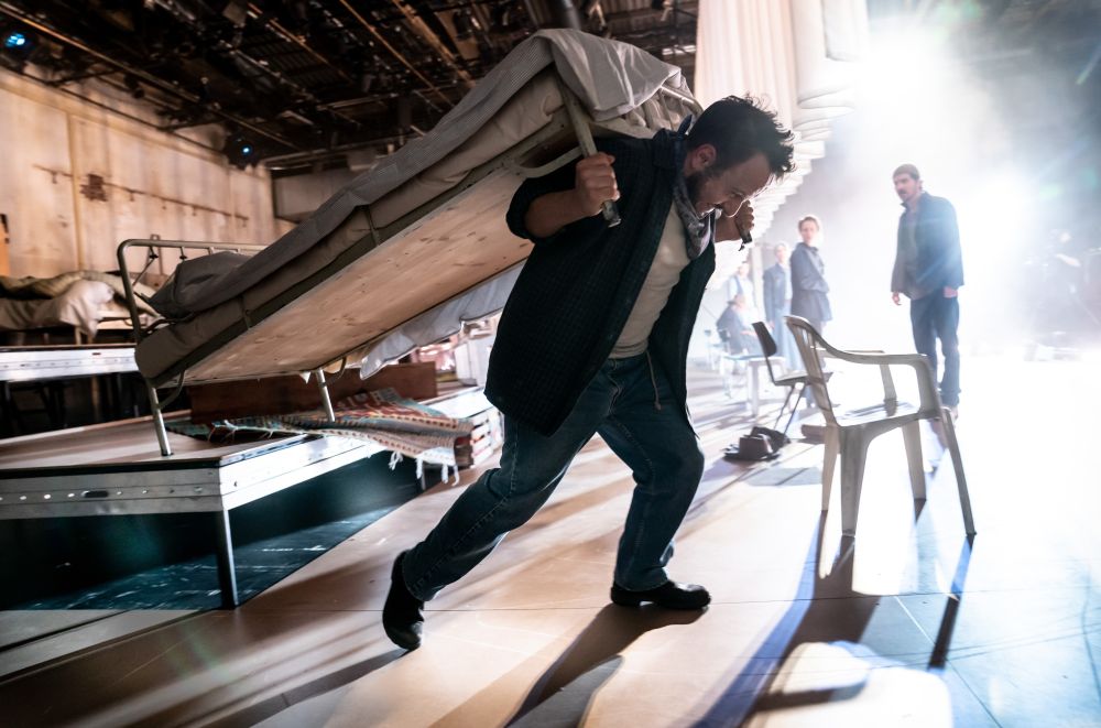 Die Joads sind die Helden in John Steinbecks Roman „Früchte des Zorns“ von 1939, einem sozialkritischen Roman, der die Vertreibung kleiner Landpächter durch Dürre, Industrialisierung der Landwirtschaft und Spekulation beschreibt. Beeindruckend inszeniert Regisseur Rafael Sanchez das Stück nach der Digital-Premiere im Dezember 2020 nun auch analog.Der Ort der Familie ist die Vorbühne, hier werden Streitigkeiten ausgetragen und hier sitzt man wackelnd im Truck, der über die Route 66 gen kalifornischen Westen donnert. Die Außenwelt ist auf die dahinterliegende Stufenbühne verbannt, die durch einen Brechtvorhang über Kopfhöhe abgetrennt ist (Bühne: Thomas Dreißigacker). Dort treten der Familie martialische Sheriffs entgegen und verweigern die Einreise in Städte; dort begegnet sie Kontraktoren, die ihr ausbeuterische Arbeitsverträge anbieten; dort findet sie vorübergehend Unterschlupf in einem staatlichen Camp und erlebt blutige Arbeitskämpfe. Es waren die guten alten Zeiten, als das Wort „Kommunist“ noch identisch mit Landesverrat war. Vor allem Seán McDonagh als Tom, Katharina Schmalenberg als Ma und Stefko Hanushevsky als Pa überzeugen mit ihrem bärbeißigen rustikalen Charme.