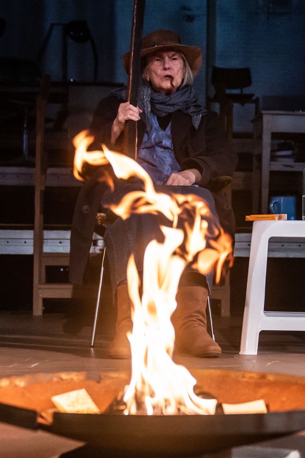 Die Familie Joad dürfte heute zu den Stammwählern von Donald Trump gehören. Sie hocken im allgegenwärtigen Blau ihrer Jeansklamotten (Kostüme: Maria Roers) auf billigen Gartenstühlen, Grandma mit Flinte im Anschlag. Der Ton ist rau, das Arbeitsethos protestantisch.Man ist stolz, den Native Americans das Land weggenommen zu haben. Eine irgendwie verarmte weiße Landbevölkerung eben.