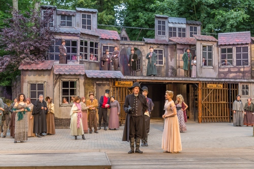 Gespannt darf man sein, wie man an der Waldbühne Hamm-Heessen das kammerspielartige „Cabaret“ (bis 8.9.) von John Kander und Fred Ebb, mit dessen Verfilmung Liza Minnelli weltberühmt wurde, auf der doch sehr ausladenden Spielfläche inszeniert. Diese Sorgen muss sich Regisseur Florian Hinxlage auf der Freilichtbühne Hallenberg im Sauerland nicht machen. Bietet Lerner und Loewes Musical-Klassiker „My Fair Lady“ (bis 8.9.) doch genug opulente Schauwerte, um auf einer überdimensionalen Bühne bestehen zu können.