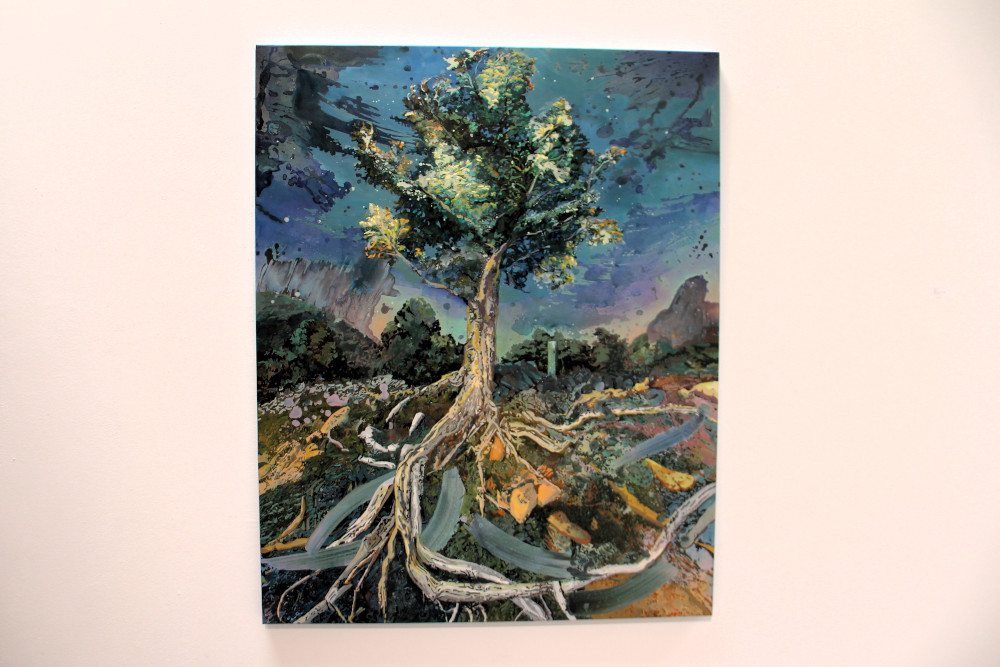Nicht nur den Wind, sondern auch die Blüte und Vergänglichkeit des Lebens erntet Sabine Beyerle in ihrer malerischen Werkschau „Harvest the Wind“ in der Galerie Anja Knoess. Auf den ersten Blick der Leuchtkraft und dem lebensspendenden Wesen der Natur verhaftet, übernehmen bald die Heralde des Welkens den Farbton, geraten karge Böden und schroffe Felsen in das Sichtfeld der Betrachter:innen. Keine kühlen Brisen, sondern heiße, trockene Sommerluft zirkuliert über den Landschaftsmotiven, die von Reisen der Künstlerin nach Patagonien in Südamerika inspiriert sind. In ihrem großformatigen Öl/Acryl-Gemälde „El Camino“ (übersetzt: Der Weg) erwartet die Vorüberziehenden ein Stammbaum der Ewigkeit, der einer letzten Ernte in Eden (noch) widersteht.