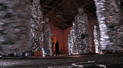 „Exuviae“ ist das lateinische Wort für eine abgelegte Tierhaut oder für eine leere Hülle. Die Orangerie des Volksgartens hängt voller lebensgroßer silberner Gestalten. Aus wechselnden Perspektiven wirken sie wie Puppen oder chinesische Krieger in Reih und Glied, oder wie eine dichte Menschenmenge. Tatsächlich beginnen sich diese Hüllen aus Stanniol zu verändern, nachdem das Licht erloschen ist. Die in Köln lebende japanische Choreographin Yoshie Shibahara ist immer für eine ästhetische Überraschung gut. So auch diesmal, denn während die silbernen Hüllen der Installation leise im Wind schwingen, agiert der Butho-Tänzer Yoshihiro Shinomura zwischen ihnen, er lädt die Menge mit einer Unruhe auf, die den Blick der Betrachter fesselt.