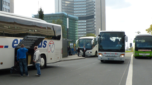 Donnerstagnachmittags um halb vier knubbelt es sich vor dem Essener Hauptbahnhof. Während „Mein Fernbus“ noch Pause macht, rollen gegenüber „Eurolines“ und „Biacomex“ an den Bordstein. Schließlich kommt noch der „Berlin Linien Bus“ hinzu. Damit ist hier unten fast genauso viel Betrieb wie oben an den Gleisen. Bloß dass es gerade zwei Dutzend Menschen sind, die ihre Taschen, Koffer oder Rucksäcke im Bauch der Roadliner verstauen. Aber ihre Zahl steigt mit jeder Woche.