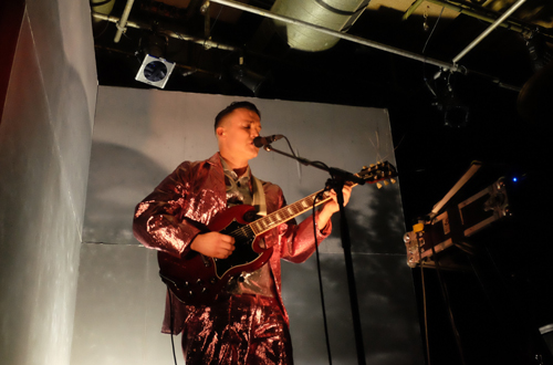 Dann betreten Susanne Sachsse und Marc Siegel, die eine mehr denn je glitzernde, queere Vaginal Davis mit silbernem Gesicht im Schlepptau haben, den Raum und positionieren sich als Trio in der einen Hälfte, während sich diagonal dazu der ein quietsch-pinkfarbenes Kostüm tragende Musiker, Begründer und Sänger der kalifornischen Postpunk-Band Xiu Xiu, James Stewart, genannt „Jamie“, auf die Bühne stellt.