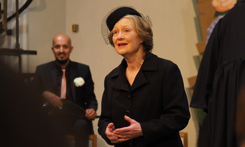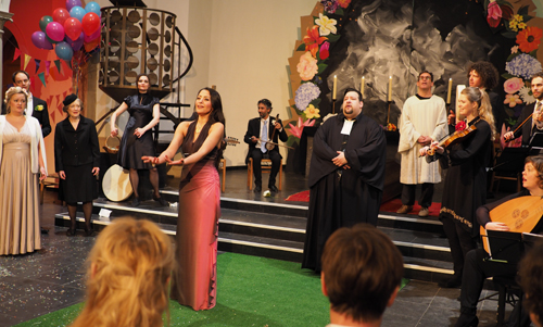 Regisseur Adrian Schvarzstein, der Commedia dell’arte in Italien studierte, holte das Stück gehobener Unterhaltung in die ausverkaufte Trinitatiskirche, indem er eine Hochzeitsgemeinde (Amor als Hochzeitsmanagerin: Sopranistin Maria Jonas) und eine Trauergemeinde (begleitet vom Tod: Tänzerin Jūrate Širvyte-Rukštelė tanzt Barock) einführte, die sich in der Kirche terminlich überlagern und von der feiernden Großfamilie des orientalischen Bräutigams überrumpelt werden, gar nicht zu reden von einem Elvis-Imitator. Ein musikalisches Durcheinander aus Liebe, Leben und Tod also, in dem das Gegen- und Nebeneinander nach und nach, über Liebe und gemeinsames Leid doch noch zusammenfindet. Im Detail war das nicht einfach zu verstehen – schon allein von der Kirchenakustik her –, aber im Ganzen deutlich genug vermittelt. Wer weit hinten saß, dürfte Probleme gehabt haben, manches Schauspielerische im Chor der Kirche mitzubekommen, auch wenn der Mittelgang mit bespielt wurde.