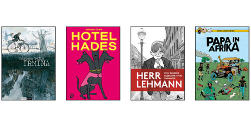 Mit „Irmina“ hat Barbara Yelin ihr vorläufiges Magnus Opus veröffentlicht: Vage auf der Geschichte ihrer Großmutter basierend, erzählt sie auf knapp 300 Seiten und in Farbe von einer Frau, die 1934 als junges, selbstbewusstes Mädchen nach London geht, um eine Ausbildung zu machen. Dort lernt sie den schwarzen Studenten Howard kennen und lieben. Doch die Umstände reißen sie auseinander: Irmina geht zurück nach Deutschland und erlebt den Aufstieg der Nazis und den Krieg. Das ändert sie. Die historisch gut recherchierte Geschichte überzeugt auf allen Ebenen: Die Hauptfigur und ihr charakterlicher Wandel ist so betrüblich wie plausibel, die aufwändigen Bilder ziehen einen förmlich in die Geschichte hinein (Reprodukt). Katharina Greve hat ihre ganz eigene Interpretation der Ligne Claire, und die verträgt sich prima mit ihren absurden Geschichten. Denn dort – in „Ein Mann geht an die Decke“, „Patchwork“ und jetzt „Hotel Hades“ – gehen die Grundpfeiler ihrer Geschichten – Raum, Zeit, Mensch – schon genug durcheinander. Da schadet ein klarer Strich nicht. Wer das Jenseits als graues Wischiwaschi imaginiert, wird bei Greves „Hotel Hades“ mit dem Gegenteil konfrontiert: Peter merkt nach seinem Tod schnell, dass der Hades eine bürokratische Hölle voller Absurditäten ist – ganz zu seinem Leidwesen, aber zur Freude des Lesers (Egmont).
