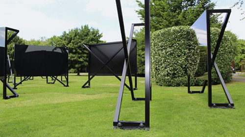 Die augenfällig modernste Arbeit lieferte der aus New York stammende Tom Burr mit seinem aus 26 schwarzen Metalltafeln bestehendem Werk „No Access“. Wie große Screens von Fernsehapparaten sehen die polierten Flächen aus, eine Assoziation, die Burr bewusst anlegte. Inspiriert haben ihn die schwarzen Gläser, mit denen die Maler im 19. Jahrhundert Landschaften spiegelten, aber die Displays der Smartphones hat Burr auch im Blick. Geht man durch das Labyrinth, lösen sich für einen Moment Zeit und Raum wie im Schwindel auf.