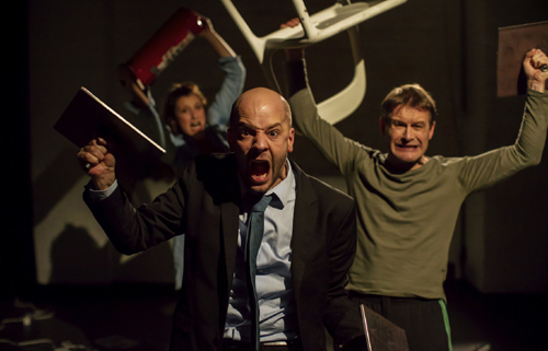 Ein Türknarren, ein Schrei und Glockenschläge – mehr braucht es nicht, um den Betrachter auf eine Szene der Angst und des Horrors einzustimmen. Die Konditionierung durch Film und Fernsehen funktioniert immer, wenn auch als Déjà-vu. Drei Darsteller (Franziska Schmitz, Kai Hufnagel, Valentin Storch) reden darüber, was den Menschen hierzulande angeblich Angst macht. Zwischen Bürolampen, Zeitungsstapeln und Stühlen wühlt man sich durch bekannte und weniger bekannte Statements und Rechercheergebnisse: Statusverlust, Fremde, Arbeit verloren, Krankheit, Waffenbesitz, Finanzcrash, Pflegefall, Wohnungsverlust sind die erwartbaren Renner im Ranking der Ängste. Das Trio hat unter Anleitung von Regisseurin Judith Kriebel diverse Bürger, aber auch die Polizei und Angstforscher befragt, taucht in Rollenspiele ein und bereitet die Ergebnisse mal als Ängste-Show, als Mutprobe oder kabarettistische Szene auf.