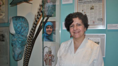 „Mein Vater war allerdings als Akademiker eingereist – und hatte den Wunsch, dass seine Tochter hier studiert. Das allerdings als verheiratete Ehefrau“, erzählte Zeynelabidin im Anschluss an die Führung durch die Ausstellung, die übrigens auch ein persönliches Stück Lebensgeschichte der Muslimin ausstellt. „Das war mein Lieblingskopftuch“, so Zeynelabidin mit einem verschmitzten Lächeln. Das türkis-blaue Stück wird nämlich in einem der Glasschaukästen gezeigt. Und das durchaus als zeitgeschichtliches Stück des „deutschen“ Kulturguts.