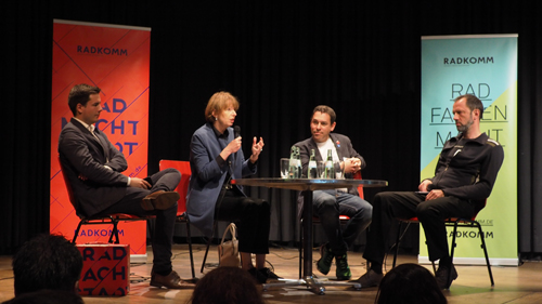 In der Podiumsdiskussion sprach Reker mit Arndt Klocke (Landtagsabgeordneter, Die Grünen) und Rainer Kiel (Fahrradstadtplaner, Deine Freunde), beantwortete aber auch vorher gesammelte Fragen. „Ich bin davon überzeugt, dass es das Allerwichtigste ist, die Haltung zu schaffen, dass Köln zwar eine Autostadt ist, mit einem stadtprägenden Unternehmen [Ford], aber dass zu einer modernen, lebenswerten Stadt der Radverkehr inzwischen in einem ganz großen Maße dazugehört.“ Die Zahlen zeigten zunehmenden Radverkehr, auch zum Transport von Waren. „Und wenn wir uns besonders Köln angucken, wie die Stadt gebaut ist und wie dicht sie bewohnt ist, dann bietet sich das ja auch an. Ich bin übrigens auch selbst zutiefst davon überzeugt, dass die Stadt viel lebenswerter wird, wenn wir die vielen parkenden Fahrzeuge von der Straße holen.“