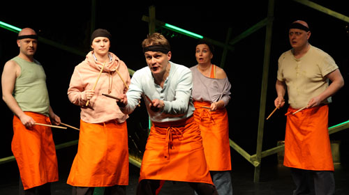 Schon die von einer poetischen Abstraktion zeugende Bühne Flavia Schwedlers gibt die anti-naturalistische Richtung vor. Das Motiv der Stäbchen wiederholt sich in den Drumsticks des Ensembles, die mit rhythmischen Schlägen den Takt der Arbeit symbolisieren. Pape und sein bravourös aufspielendes Ensemble nutzen das Als-ob des Theaters als Prinzip: Die Schauspieler beobachten und kommentieren sich gegenseitig, zeigen die langsame Verfertigung einer Szene bei der Probe und freuen sich ungeheuer an der Verkleidung. So geben etwa Till Brinkmann und Kai Hufnagel als zwei Flugbegleiterinnen ganz reizende Transen ab, und Manuel Moser kann sicherlich als eine der elegantesten asiatischen Tänzerinnen der Stadt gelten.