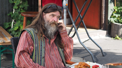 Mit 24 habe ich den Entschluss gefasst, auf Wanderschaft zu gehen. Dabei war ich drei Jahre zu Fuß unterwegs und die anderen zehn Jahre mit Zirkuswagen, Zelten, in den verschiedensten Berufen und Berufungen unterwegs. Ich spiele 20 Instrumente und habe mit einer künstlerischen Zielrichtung in allen Handwerksberufen gearbeitet. Zum Abschluss, nach dem Mauerfall und dem ersten Irakkrieg hatten wir unsere Wagen neben dem Flughafen Hahn im Hunsrück. Mit Ende des Kalten Krieges wurden die ganzen Waffen aus den Bunkern geholt, in die Flugzeuge gesteckt und über Kuwait abgeworfen. Danach kam kein Flieger mehr zurück, und das hat mich höchst elektrisiert, mich mit der Frage „Deutschland und Frieden“ auseinanderzusetzen. Deshalb habe ich beschlossen, einen Stein durch Deutschland zu rollen, von hier nach Berlin, 1993 bis 1994, und bin nach dieser Aktion, die für mich persönlich von höchstem Wert war, die aber in der Aufmerksamkeit der Öffentlichkeit völlig untendurch gegangen ist, nach Köln zurückgekehrt und habe jetzt hier schon wieder 21 Jahre auf dem Buckel und davon zehn hier auf dem Eifelwall.
