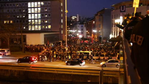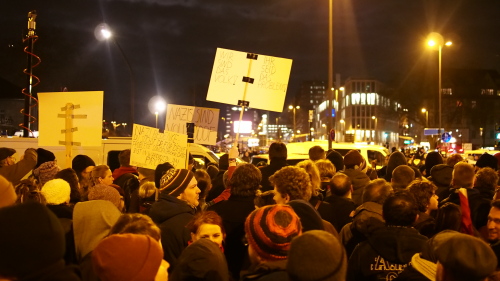 Gegen 19:45 Uhr traten die Kögida-Teilnehmer den Heimweg an. Das durfte als Erfolg gewertet werden. Die Gegen-Kundgebungen lösten sich ebenfalls langsam auf; ein guter Teil der Für-den-guten-Zweck-Frierenden verabschiedete sich über die Hohenzollernbrücke, bis vorgeschlagen wurde, geschlossen den Kögida-Weg über die Deutzer Brücke zu nehmen. Die Polizei war auf beiden Seiten des Rheins auf alles vorbereitet gewesen und ging in allem auf Nummer sicher. „Arsch huh“-Sprecher Hermann Rheindorf kritisierte dann auch zum Abschluss noch einmal, dass die Polizei den Raum nicht mehr geöffnet habe. Brigitta von Bülow von „Köln stellt sich quer“ fügte heute hinzu, dass viele Teilnehmer das Demontrationsrecht durch die Strategie der Polizei nicht hätten wahrnehmen können. Hans Schwanitz, der ansonsten recht zufriedene Vorsitzende der Kölner Grünen, erklärte in einer Pressemitteilung, man müsse darüber nun sprechen, damit es sich nicht wiederhole. Sicher muss man in Zukunft hinsichtlich der Teilnehmerzahlen zusammen mit der Polizei noch flexibler planen.