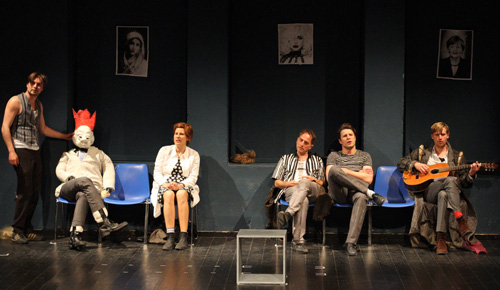 Der König hängt ziemlich tot in den Seilen. Das Gesicht maskenhaft weiß, auf dem Kopf die blutrote Krone. Der König ist tot, es lebe der König. Wie ein Memento lümmelt der von Macbeth umgebrachte Duncan im Plastikgestühl im Theater im Ballsaal.