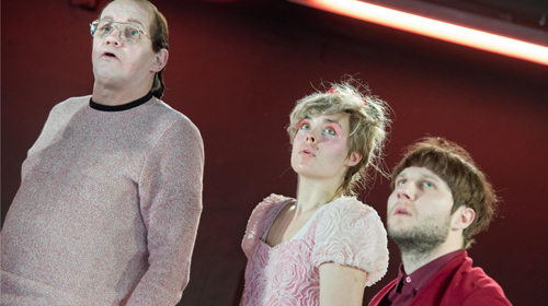 Auch dem Abhängigkeitsverhältnis von Tochter He zur Mutter fehlt es nicht an einem Unterstrom von Herrschsucht und Unterwerfung. Julia Kieling im Kunstfelljäckchen mit überlangen Ärmeln darf zwar das Geländer polieren, ist aber ansonsten frei, mit dem biederen Kammerjäger Kleinmann (Alois Reinhardt) anzubändeln. Er soll die im Haus grassierende Speckkäferplage beseitigen – ein untrügliches Zeichen für die Anwesenheit des Todes. Nur die Nelly der Laura Sundermann entgeht der umfassenden grotesken Zurichtung. Zwar fantasiert sie sich – anders als im Stück, in dem Franz zunächst durch eine Pizzaschachtel spricht – ihren Zwillingsbruder als zweites Ich herbei und spricht seinen Dialogpart mit, doch dann stapft sie mit Realitätssinn und Aufklärungswillen durch die Wahnwelten der Hausbewohner. Nur mit Mühe entgeht sie am Ende deren Willen, sie zur Wiedergängerin von Franz machen zu wollen. Linders Stück ist sicherlich kein so großer Wurf wie der Vorgänger „Der Mann aus Oklahoma“, aber Salehpours Interpretation ist doch allzu sehr auf grellkomische Wirkung aus, anstatt auch Nachtseiten des Stücks auszuloten.