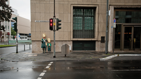 Der österreichische Aktionskünstler Merlen Bauer, Jahrgang 1974, begab sich 2011 mit dem Schauspieler Christian Hockenbrink auf eine Reise durch die Kölner Geschichte. In einem schwarzen Anzug gekleidet baten sie an ausgewählten Orten verschiedene Kölner Bürger stellvertretend die Geschichte ihrer Heimatstadt zu erzählen. Begleitet wurden sie dabei immer von zwei Maultieren. Das entstandene Filmmaterial haben die beiden Künstler nun zu einem Film überarbeitet. So fürchtet beispielsweise ein Museumsdirektor um den Bestand seines Museums oder eine Schülerin fasst ganz nebenbei den Untergang des Bankhauses Oppenheim zusammen. Außerdem durchwandern Fussballfans, Straßenkünstler oder Kirchchöre singend die Stadt, die so zum Mittelpunkt der Erzälungen wird. Die Preview des Films findet am Donnerstag, 6.9. um 19 Uhr im Schaufenster des Ladenlokas Aachener Str. 7 statt. Vom 7.-11. September ist er dann aus 24 Stundenschleife zu sehen.