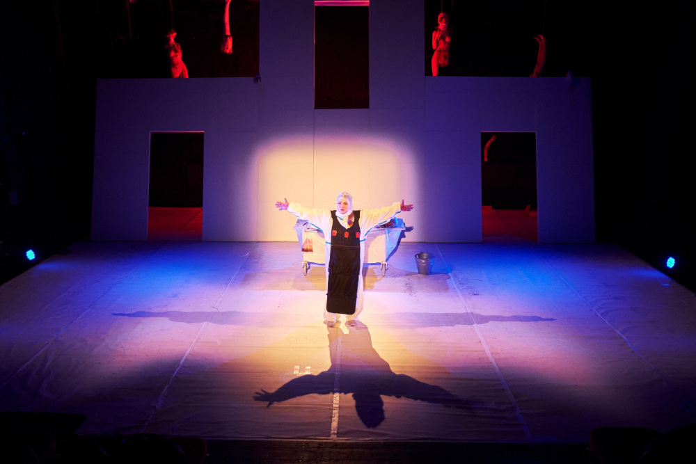 Der Blässe steht der Tod in mancherlei Schattierung, doch vor allem imponiert frisches Blut auf weißem Laken und reinen Fassaden. Als befleckter Tempel präsentiert sich bereits zu Anfang der Reise ins Trauerland das Haus der heiligen Göttin Artemis, in dem des Agamemnons Tochter Iphigenie ihrem Schlacht-Handwerk gegen Eindringlinge nachgehen muss. In einer Adaption von Euripides’ „Iphigenie in Aulis“ führt das Ensemble des Deutsch-Griechischen Theaters in der Spielstätte des Ehrenfelder Urania Theaters die klassische Geschichte um Krieg, Götterverehrung, selbstlose Opferbereitschaft und Geschwisterliebe mit aktuellen Themen wie Flüchtlingsdramen und der Corona-Pandemie zusammen. Aus der Vermischung entsteht ein nicht minder tiefrotes Abbild des Untergangs der Spezies Mensch, die in beeindruckender Kreativität Hass, Intoleranz sowie Ignoranz zelebriert und wie keine andere Lebensform das Wort „Grausamkeit“ in schönsten Lettern niederzuschreiben vermag. Das epische Bühnenbild (Zezo Denekov) der Inszenierung umrahmt dabei majestätisch strahlend die dunkle Handlung einer zeitlosen Geschichte.