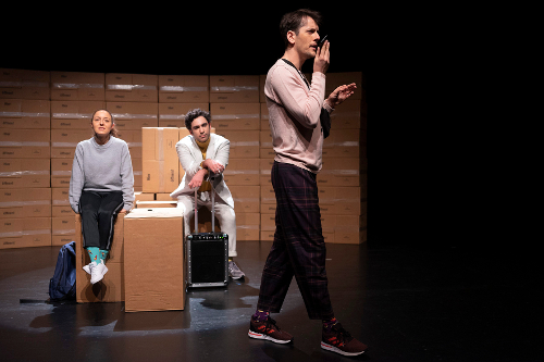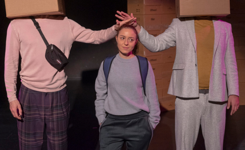 Es fing schon spannend an im Jugendtheater der Comedia: Da soll eine Menge großer Kartons von den Kids zwei Etagen hoch in den grünen Saal geschleppt werden, wortreich gebeten von einem jungen Mann im weißen Anzug. Ist er der Hausmeister oder einer der Schauspieler? Egal, die Kolonne zieht nach oben, wo man auf das Geschrei der Papageien achten soll. Im Theater? Hier bilden auch schon weitere Kartons eine ganze Wand – Puzzleteile der Lebensplanung, die man sich selbst zusammensetzen kann oder auch Symbol für häufigen Wohnungswechsel? Aber gleichzeitig eine praktische und transportable Kulisse, da das Ensemble mit dem Stück auch auf Wanderschaft gehen soll.