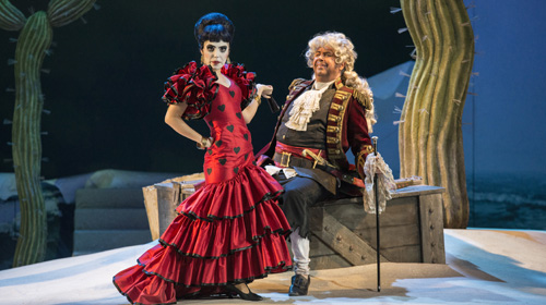 Die Regie musste sich dafür gar nicht groß verrenken, denn die Geschichte liefert bereits erstklassige Ansätze. Hauptfigur ist der alte Kapitän Morosus, der bei seinen Seefahrten offenbar allerhand Dublonen eingeheimst hat. Joosten und Ausstattungs-Altmeister Johannes Leiacker zeigen eine ergraute Version des Kino-Piraten Jack Sparrow, der auf einer Insel in seiner Schatztruhe haust. Darum herum wuselt die Haushälterin in einem papageienbunten Glitzerkostüm, welches gut aus dem Fundus des DDR-Fernsehballetts stammen könnte, und feudelt die Kakteen ab. Leider kann sie nie die Klappe halten, was der alte Pirat schon deshalb kaum ertragen kann, weil er vom lauten Kanonendonner ein Problem mit seinen Ohren hat.