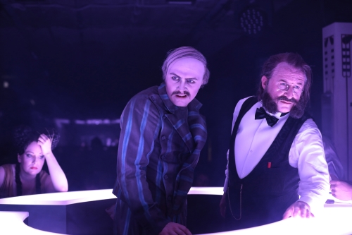 Dazu gleich vorweg: Es hat alles auf den Punkt gepasst und geklappt, die Inspizienz (Kathrin Vinciguerra), die Beleuchtung, die Blitze, der Qualm, die Explosionen (Licht: Andreas Grüter), die Auftritte, der Maskenwechsel und die Musik. Dirigent Gerrit Prießnitz, regelmäßig in Wien, Chemnitz und an der Oper Köln tätig, hätte gut drei Arme brauchen können, denn er begleitete auf dem Flügel in einer kleinen Seitennische, dirigierte gleichzeitig die Handvoll engagiert aufspielender Musiker des Gürzenich-Orchesters und musste dazu die Sänger führen, dies bei begrenzter Sicht, ohne Bildschirme und ganz ohne Souffleur.
