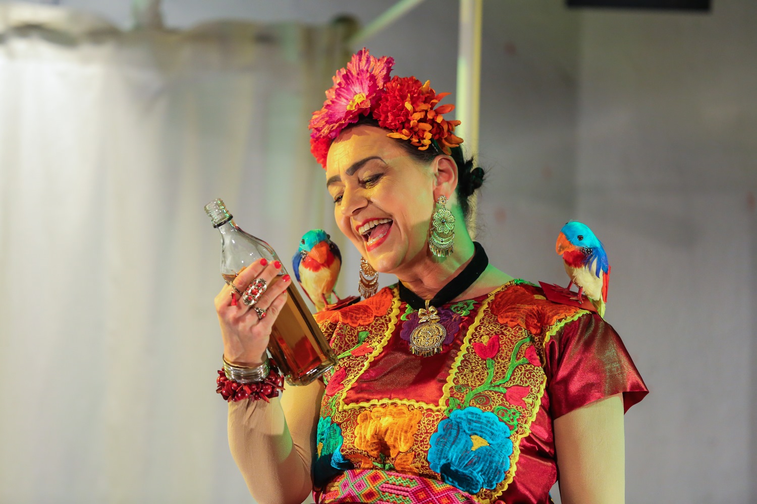 Juliane Ledwoch: Ich hatte vor einiger Zeit schon mal ein Solostück gespielt: „Das kunstseidene Mädchen“ von Irmgard Keun. Ich war seit längerer Zeit auf der Suche nach einem geeigneten Stoff für ein neues Solostück. Die vorhandenen Vorlagen haben mir alle nicht so gut gefallen. Also beschäftigte ich mich mit historischen Personen. Und da bin ich auf Frida Kahlo gestoßen. Um ehrlich zu sein: zwischen zwei Vorstellungen in der Garderobe des Millowitsch Theaters, in dem ich als Ensemblemitglied im letzten Stück mitwirkte. Dann habe ich etliche Biografien über Frida Kahlo gelesen. Und da wusste ich, das ist der richtige Stoff, um ein eigenes Theaterprojekt auf die Beine zu stellen.