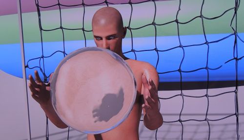 Im Atelier 2 löst Finn Wagner die Oberfläche von Gegenständen und bringt sie auf anderen Materialien an. Verwirrend und faszinierend ist diese Installation für die eigene Wahrnehmung. Wasser fließt über Gegenstände, die nicht mehr sie selber sind. Man sieht und hört das echte Wasser. Auf einem Bildschirm sieht man einen Avatar, der mit Wasser spielt und erhält als Betrachter ein haptisches Gefühl ohne etwas zu berühren.