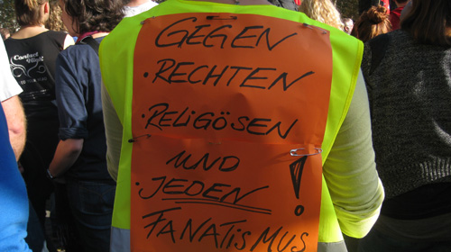 Am Roncalliplatz werden weitere Reden gehalten. Ein Aktivist erklärt, dass Salafisten und Neonazis viele Gemeinsamkeiten hätten. Beide seien radikal, würden ausgrenzen und seien gefährlich. Und sie wären daher eher Zwillinge als Gegner, so sein Fazit. Gegen 16 Uhr löst sich die Demonstration schließlich auf. Laut Veranstalter haben 3400 Menschen teilgenommen. Köln hat sich erfolgreich gewehrt und Flagge gezeigt. Eine gelungene Aktion, bei der nur leider die Reden oft schwer zu verstehen waren, weil die Anlage übersteuert war.