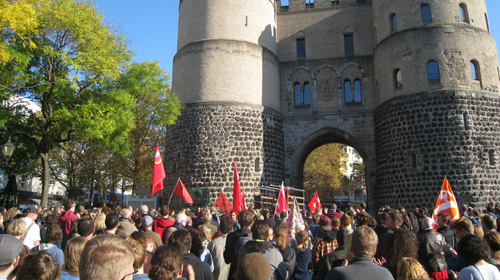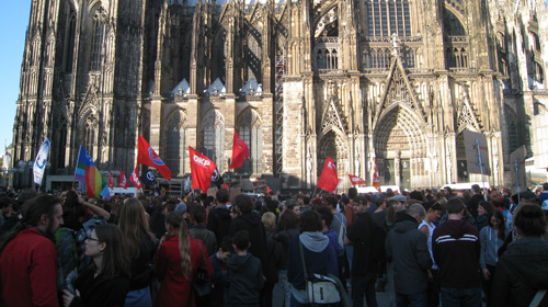 Um 13 Uhr geht es bei strahlendem Sonnenschein am Rudolfplatz los. Während sich auf einer kleinen Bühne immer wieder Aktivisten mit Reden an die Demonstranten wenden, wächst die Versammlung von Minute zu Minute. Die Redner verlangen mehr Engagement, mehr Bürgerbeteiligung und dass sich die Ereignisse vom 26. Oktober niemals wiederholen sollten.