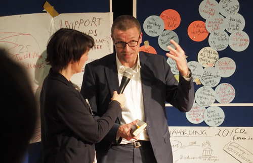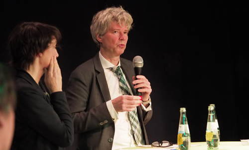 Harald Rau hatte auch Zahlen mitgebracht – seine Berechnungen zeigten: „Selbst wenn wir alle Autos in Köln lahmlegen, haben wir 2030 gerade ein Viertel des Einsparziels erreicht.“ Von den 12 Mio. Tonnen Kölner CO2 im Jahre 1990 sind bis dahin 40% einzusparen. Inzwischen beginne Nachhaltigkeit aber „wirtschaftlich interessant zu werden“, wie das Beispiel der Ford-Fahrräder zeige. Viele Kölner Firmen hätten „die Chance verstanden“ und er sei überzeugt: „Köln stellt eine ideale Metropole dar, um solche neuen Formen der Mobilität, der Energieversorgung und so weiter sozial verträglich auszuprobieren.“ Es sei jetzt „unser Job, das so weiter zu treiben, dass die Firmen und Menschen das mehrheitlich verstehen“, denn man sei erst am Anfang.
