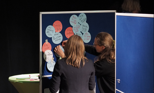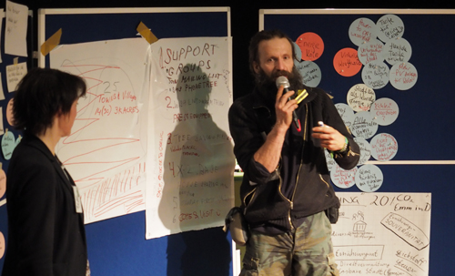 Die Besucher sollten in „Themenclustern“ etwa 20 Minuten eigene Ideen zu Energie, Ernährung, Verkehr und zum Schutz des Hambacher Forsts besprechen und sammeln. Daran nahmen auch Gäste aus Politik, Wirtschaft und Stadtgesellschaft teil, die ausgefragt werden konnten. So erklärte etwa Thomas Dittemer, strategischer Planer bei der KVB, in einer Gruppe, dass man nun „relativ zeitnah“ von 8 auf etwa 50 Elektrobusse aufstocken werde, allerdings mit der Planung der Einsätze Schwierigkeiten habe, da die Reichweite der Busse unklar sei. Für das „Angebot“, was etwa höhere Taktungen und durchgängige Nachtfahrten anginge, sei nicht die KVB, sondern die Stadt als Auftraggeber zuständig. Thomas Kahlix hatte schon für den Bürgerhaushalt seinen Vorschlag eingebracht, Radschnellwege mit dem vorhandenen Schienennetz zu verbinden, wofür fünf Meter zusätzlicher Raum an den Trassen gebraucht werde. Der Verkehrscluster sprach auch über Lastenfahrräder – demnächst von Donk-EE an 50 Kölner Standorten verfügbar, sobald die App funktioniere – für den Lieferverkehr und Großeinkäufe. Außerdem wurden Ideen aufgenommen, wonach Paketdienste sich untereinander vernetzen und Paketzentren teilen sollten. Der Energie-Cluster wollte vor allem die Braunkohle abschalten und die „Kölner zu Energieaktivisten machen“, also die Einzelverantwortung mehr vermitteln.