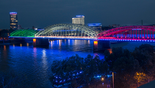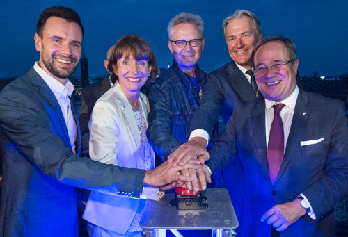 Bis zur blaue Stunde haben sie mit Medienvertretern auf der Dachterrasse des EASA-Gebäudes gewartet, um den Startknopf zu drücken. Gemeinsam mit dem Land NRW gratuliert Köln mit der Lichtkunstinstallation „Light It Up!“ der Spielemesse Gamescom zu ihrem zehnten Jubiläum. Bis zum 26. August, also während der gesamten Messe, leuchtet das Kölner Rheinufer jeden Abend mit Einbruch der Dämmerung. Nicht nur markante Objekte wie der Messeturm, der Musical Dome, das RTL-Gebäude oder die Brücken sind illuminiert, auch kleinere Gebäude sind Teil des Lichtkonzepts. Mit den Gebäudeeigentümern habe die Zusammenarbeit gut geklappt, so Batz. Die Farbwahl ist nicht zufällig: Blau ist die Farbe der Gamescom, die Farben Grün, Weiß und Rot stehen für das Land. „Das sieht ja aus wie NRW“, ruft Reker mit Blick auf die Hohenzollernbrücke beeindruckt, als die Lichter angehen.