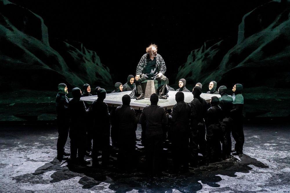 Regisseur Rafael Sanchez und Bühnenbildner Simeon Meier verorten das Drama in einer rabenschwarzen (verbrannten?) Welt, in der ein paar „Beton“-Platten und Projektionen genügen, um Räume zu schaffen. Allerdings spielt die Inszenierung der Parallelhandlung um den Grafen Gloster (Bruno Cathomas), seinen Sprößlich Edgar (Katharina Schmalenberg) und seine unehelichen manipulativ-verschlagenen Sohn Edmund (Seàn McMcDonagh) breit aus. Und so entsteht eine merkwürdig additive Szenenreihung, in der Lear und Gloster als die beiden betrogenen Väter gleichrangig nebeneinander stehen – gerade auch weil Bruno Cathomas groß aufspielt. Klar, es geht um Gier nach Macht, um abtrünnige Kinder, um Manipulation und Opportunismus – und die Gefahr des Nihilismus, die immer wieder beschworen wird. Und um Ordnung. Doch worum es der Inszenierung letztlich geht, das weiß man auch nach dreieinhalb Stunden nicht wirklich.