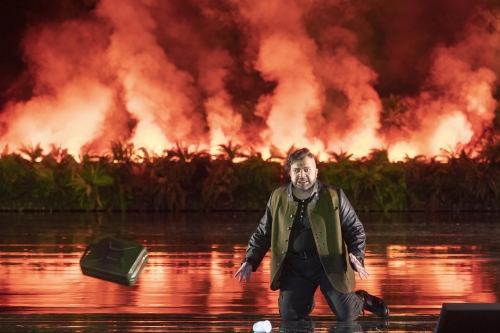 Denn Schwab hält sie durch, diese enorme Spannung und Energie des Auftakts. Otello und Jago sind Frontschweine, wie sie „Apocalypse Now“ entsprungen sein könnten. Spätestens, wenn im Hintergrund Dschungelvegetation auftaucht und anschließend im hellen Schein eines Napalmangriffs aufglüht, drängt sich diese Assoziation auf. Das ist typisch für Schwab, der viel Sinn fürs Naheliegende und Eindeutige hat, den Zuschauer nicht mit vagen, unausgegorenen Ideen hängen lässt; erst recht keine Figuren umdeutet. Und doch ist die Geschichte keineswegs so einfach strukturiert wie der kahlgeschorene Titelheld, ein tumber Haudrauf, der eigentlich nur den Krieg kennt. Schnell wird klar, dass die Kriegsbilder ebenso wie die multiplen Abbilder seiner selbst, die zombiegleich hinter halb geöffneten Jalousien lauern, Dämonen in seinem Kopf sind, im Hirn eines seelisch verkrüppelten Psychopathen. Dass die Jalousie im Französischen denselben Namen wie die Eifersucht trägt, wird hier sinnfällig. Denn es ist ja die Eifersucht, geschürt vom Anführer der Dämonen, dem teuflischen Opportunisten Jago, die den großen Befehlshaber Otello zerfrisst und zu Fall bringt. Die Intrige um das wohl berühmteste Taschentuch der Literatur- und Operngeschichte verliert in dieser Erzählung stark an Gewicht. Das macht aber nichts.