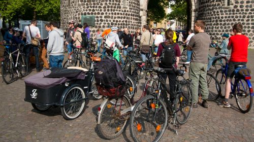 Zunächst sieht das Grüppchen, das sich am 31. Mai 2013 zur monatlichen Critical Mass Fahrradtour auf dem Rudolfplatz versammelt hat, nicht gerade wie eine Masse aus. Doch nach und nach wächst die Gruppe auf etwa 120 Teilnehmer an. Eltern mit Kindern, Rentner mit Rückspiegel am Fahrrad, Radsportler und Hobbyradler plaudern über ihre Lenker hinweg miteinander.