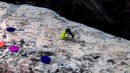 Rostige Nägel stecken in zwei Baumstümpfen, die dadurch verbunden werden. Farbige Baumwoll- und Pflanzenfasern sind darin verwoben. Die Opfermaterialien sind ein magisches Objekt vom Kongolesen Nkondi Konzo aus dem 19. Jahrhundert.