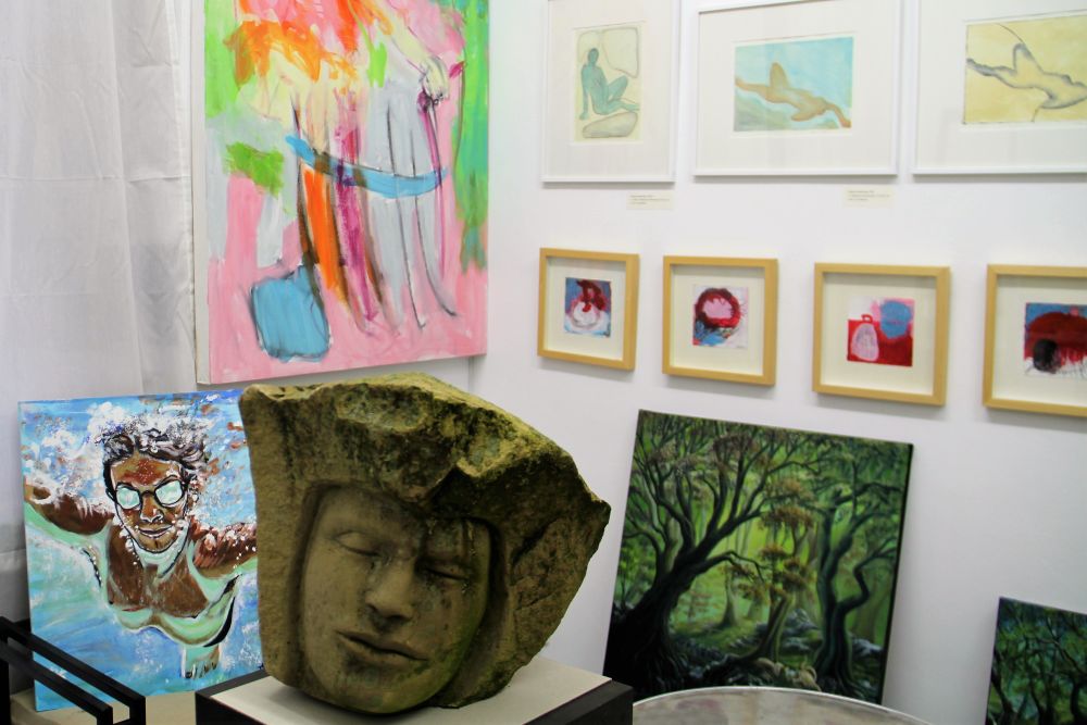 Dabei bilden die Künstlerinnen eine klare Mehrheit. In vielen der Exponate werden die Besucher:innen dabei selbst von weiblichen Motiven und Formen betrachtet (wenn sie es denn zulassen). Das Spektrum ist hier mindestens genauso breit wie ein zur Regenzeit anschwellender Rhein zwischen Deutzer- und Hohenzollern-Brücke. Neben expressionistischen Öl- und Acrylmalereien (Regina Maria Bußmann, Mara), romantisch-morbiden Stillleben (Oliver Jacob) füllen sozialkritische Popart von Malte Sonnenfeld, farbintensive Comic-Zeichnungen (Uwe Gremmel), experimentelle digitale Fotokunst (Anne Rufert), Miniatur-3-D-Objekte in Form von Frollein Suomis „Magic Boxes“ sowie eine aus Sandstein geborene Skulptur (Traudel Messerschmidt) das Areal in Dezimeterabständen. Radierungen, Monotypien (Drucke), Grafiken als Linolschnitte bis hin zu Mischtechniken und naive Kunst komplettieren ein sehenswertes Repertoire, das einzig auf Video-Installationen verzichtet und eine inhaltliche Zeitspanne von der Antike zur Moderne abbildet. Im Gegensatz zu oftmals reizüberflutenden Gemeinschaftsausstellungen mit inflationären, trendigen Leitgedanken zeichnet sich die aktuelle Werkschau in der Eyegenart durch die Freiheit der Künste und eine liebevoll anmutende Kuratierung aus. Alle Werke finden hier ihren Platz, der, trotz seiner begrenzten Kapazitäten, nicht einengt und die Arbeiten wertschätzend präsentiert.