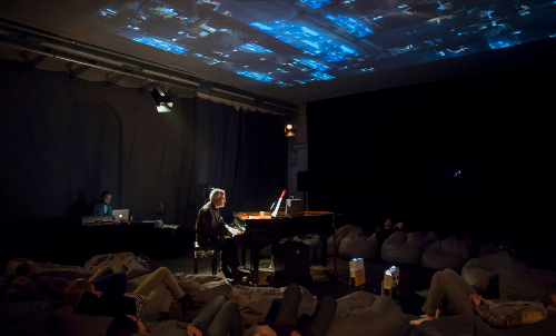 Am zweiten Abend präsentiert das theater-51grad „Blur – 6 Miniaturen zur Unschärfe“, genauer gesagt zwei der sechs von Sergej Maingardt konzipierten Miniaturen. Regisseurin Andrea Bleikamp kündigt an, den gesamten Zyklus Ende 2019, Anfang 2020 zu zeigen. Im dunklen Orangerie-Theater schauen die Gäste, in Sitzsäcken liegend, auf Videoinstallationen von Jens Standke. Schauspieler Fabian Ringel untermalt das Bild- und Ton-Feuerwerk mit eindringlichen Texten von Rosi Ulrich. „DELTAx_PHYSIK“ thematisiert die von Werner Heisenberg postulierte Unschärferelation, mischt Einblicke in sein Leben (u.a. die Liebe zu Adelheid von Weizsäcker) mit Gedanken zur Atomphysik und dem Wesen von Elementarteilchen.
