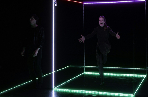Die Performer Alejandra Jenni und Constantin Hochkeppel sind im Orangerie-Theater großartig in Form. Sie bewegen sich in weitgehender Eigenregie meist in Uhrzeiger-Manier um einen offenen, in seinen Möglichkeiten großartig ausgereizten LED-Lichtkubus herum und durch ihn durch. Die Möglichkeiten von Physical Theatre werden beeindruckend zum Vorschein gebracht. Es ist keine Absage ans Wort oder ans klassische Schauspiel, sondern bezieht es gekonnt ein und geht darüber hinaus. Die Bewegungen sind kleinteilig und durchaus humorvoll durchchoreografiert und die Körperbeherrschung wie etwa beim Roboterhaften und Parodistischen ist allein den Eintritt wert. Auch die sprachliche Ebene mit einem halb englischen, etwas heruntergekommenen Deutsch aus der Zukunft funktioniert und ist immer spezifisch. Da KimchiBrot zudem schon mit „Living Happily Ever After“ (WA 22.-24.11., Studiobühne) 2017 den Kunstsalon-Theaterpreis gewonnen hatten, war es nach der Vorführung sehr schwer sich vorzustellen, dass die Produktion, diese Art des Theaters in dieser Form am Ende nicht ausgezeichnet würde. Dank des tollen Auftakts herrschte beste Laune in den zwei Stunden Umbaupause für das nächste Stück; im Garten gab es Musik von Lightning Jules und Stereo Naked sowie ausgezeichneten und sättigenden Gemüsecurry der Bochumer „Wohnküche“ im Angebot.