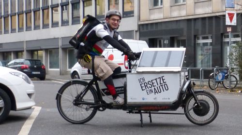 Allerdings muss die Fracht, die per Lastenrad durch die Gegend bewegt sein will, nicht immer zappelig sein. Ein Grund, weshalb jetzt auch Transportprofis hellhörig werden. Und die Bundesregierung: „Ich ersetze ein Auto“ heißt das vom Umweltministerium gesponserte Pilotprojekt – humorvollerweise beim Deutschen Zentrum für Luft- und Raumfahrt (DLR) angesiedelt. Seit dem Sommer sausen 40 Elektro-Lastenräder durch Großstädte der Republik – aus NRW sind die Düsseldorfer „Rot-Runner“-Kuriere mit vier E-Frachtern auf der Piste. Maximal zwei Kisten mit Akten und Laborproben, Ersatzteilen oder anderem Kleinkram sind meist schneller als per Benzinmobil beim Kunden.