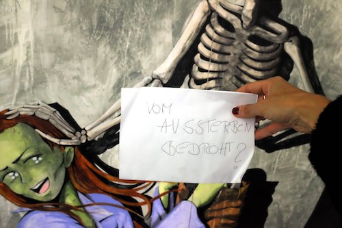 In der aktuellen Ausstellung luken, schaurig-schön, eingebettet in Comics, Knochengerippe und Kadaver hinter Mülltüten hervor oder sitzen auf Toiletten. Der Protagonist in jenem märchenhaften Comic, ein 30-Jähriger lüsterner Mann, der noch Jungfrau ist, ist so darauf erpicht, sexuelle Genugtuung zu finden, dass er nicht davor zurückschreckt, sich dem Tod hinzugeben. Passend zu dieser künstlerischen Morbidität stellt sich die Frage: Sind Kunstvereine vom Aussterben bedroht? Oder: Wie funktioniert es, sich, fernab von staatlichen Instutionen, auf dem Kunstmarkt zu behaupten? Rutschen Vereine bald tot ins stille Örtchen? Juliane Duft: