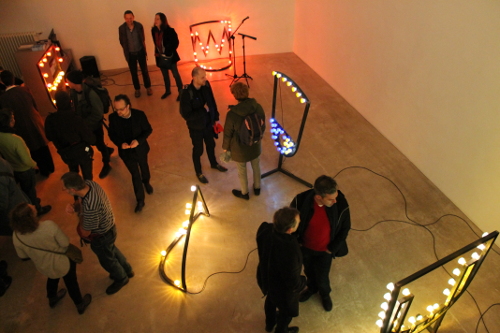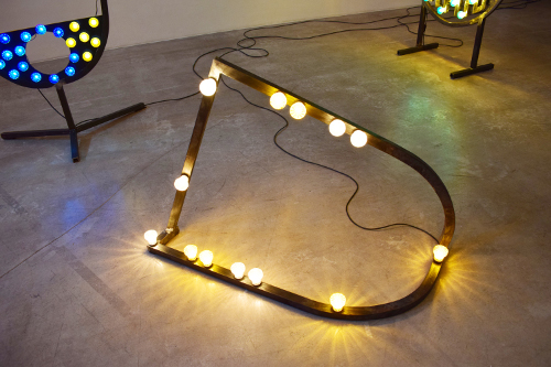 Wie Überbleibsel eines Jahrmarkts leuchten Selma Gültopraks Gebilde aus Licht und Stahl auf der abgedunkelten Ausstellungsfläche der artothek – Raum für junge Kunst. Besucher halten sich am Rand, steigen bedacht über Stromkabel und fügen sich wie Schatten in die Installation mit ein.