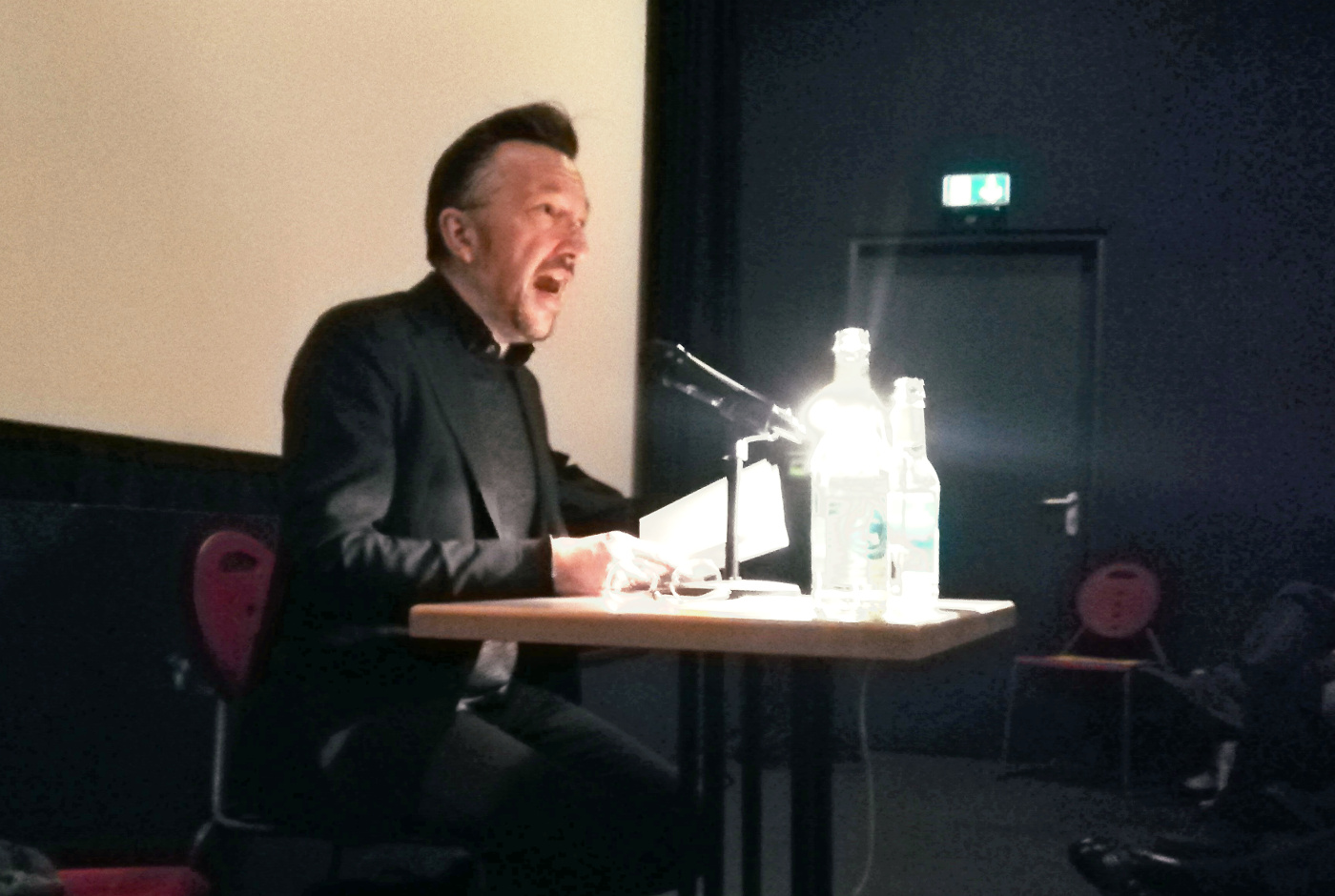 Gerrit Völker, Moderator des Abends, wollte das Thema gleich zu Beginn abhaken, bevor Bärfuss vor dem zahlreich erschienenem Publikum im Odeon-Kino aus seinem neuen Erzählband liest. Wie also fühlt sich das an, so als Büchner-Preisträger? Dem Schriftsteller wurde diese Frage sicher nicht zum ersten Mal gestellt. Dementsprechend fiel seine Reaktion aus: „Können wir nicht über etwas anderes sprechen?“ Nur um dann doch noch kurz auszuholen. Klar, er freue sich. Doch der große Hype, gerade in seiner Schweizer Heimat, ist ihm auch sichtlich unangenehm: „Die Schweizer drehen durch. Für die bin ich schon zur Berührungsreliquie geworden.“