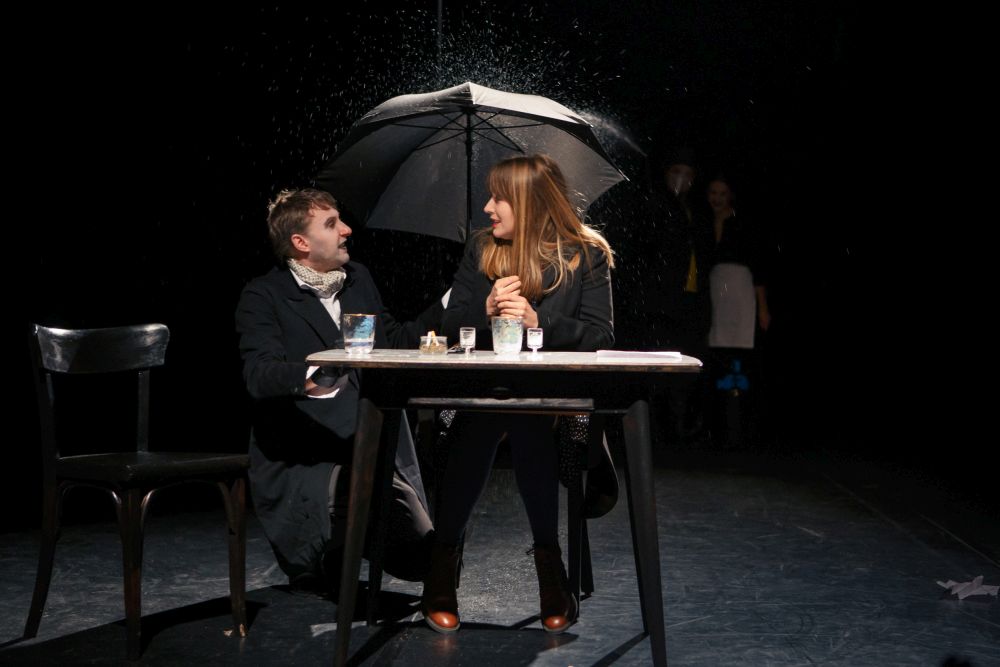 Fast zwei Stunden lang hat die Autorin (Lucia Schulz) um Sätze und Engagement gerungen. Schließlich steigert sie sich in eine nicht enden wollende „Ich scheiß’ drauf“-Suada: Sie scheißt auf alles, von Obdachlosen bis Mädchenhandel – und greift zur elektrischen Gitarre. Ein politischer Wechsel? Oder Eskapismus? Das nö theater spielt „M? – Eine Stadt sucht keinen Mörder“ nach Fritz Langs Filmklassiker, übernimmt aber nicht den Plot, sondern „nur“ die präfaschistische Atmosphäre. Der erste Teil des von Stefan Rogge inszenierten Abends ähnelt einem szenischen Kaleidoskop. Die Autorin müht sich am Tisch mit der Schreibmaschine ab, ein Uniformierter mit Pinocchio-Nase und Guardia Civil-Helm nervt sie zwischen Hilfestellung und Drangsal; ein Mann namens Soundso (Janosch Roloff), der aus dem 19. Jahrhundert zu stammen scheint, kommt in seine Heimatstadt zurück und wird als Fremder abgewiesen. Dazwischen intoniert der Musiker Philipp Ullrich harte Rocksongs. Das Präfaschistische liegt in den Spurenelementen des Ressentiments und der Verdächtigung. Es folgen zwei große Dialogszenen, in denen die Autorin gegenüber Soundso zwischen gesellschaftlicher Mutlosigkeit, der Anprangerung ausländerfeindlicher Pogrome und einer Hypersensibilität changiert. Eine Mittagessensszene in einem NS-Haushalt mit einem latent bedrohlichen Braunhemd-Hausherrn (Yannick Hehlgans) schließt sich an – bis die Autorin „Scheiß drauf!“ brüllt und die Kunst damit kapituliert. Die Schürfarbeit im Atmosphärischen eines (Prä-)Faschismus ist ehrenwert, aber sie bleibt letztlich zu inkonsequent, zu assoziativ-mäandernd und ästhetisch divers.